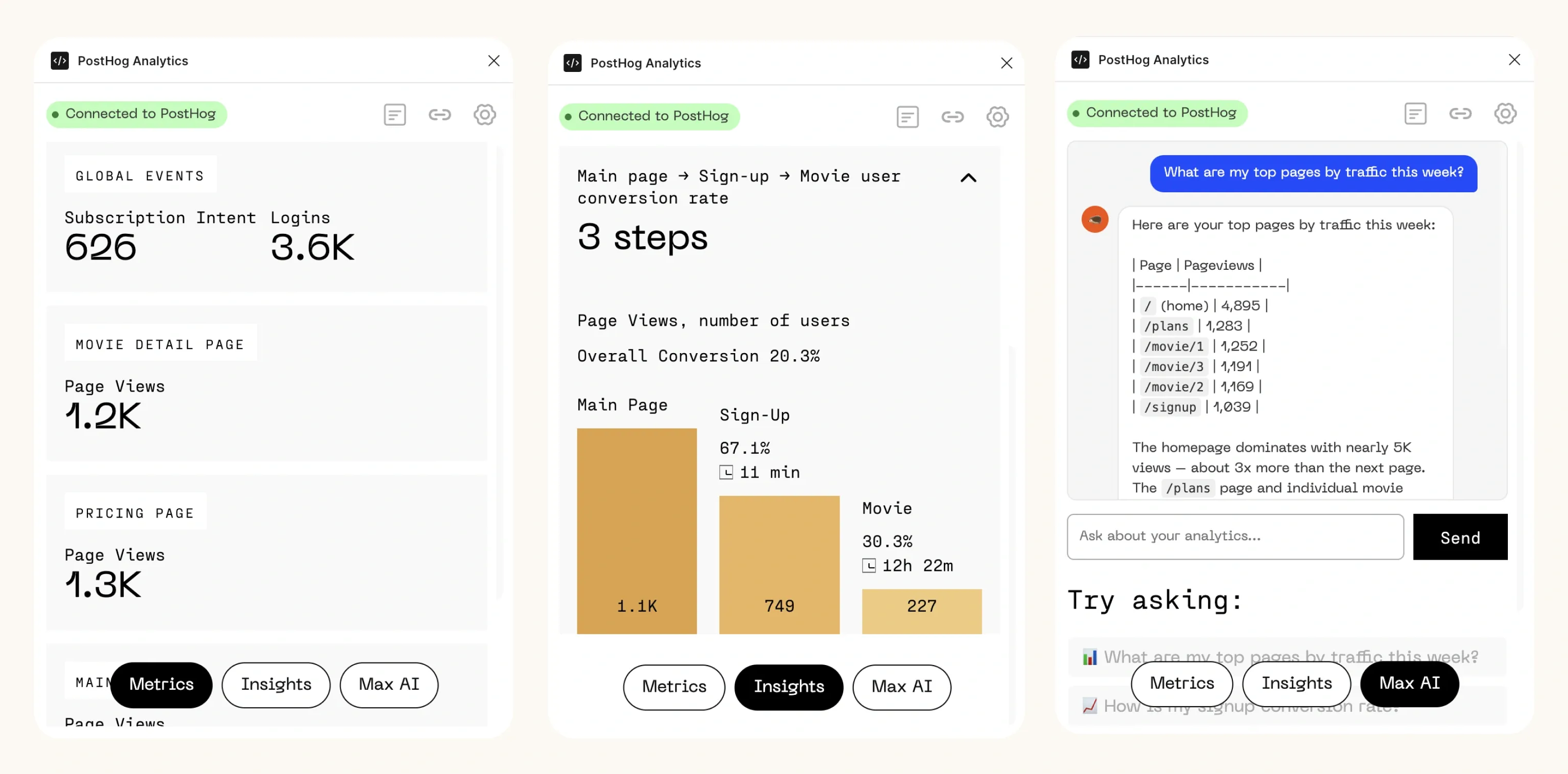 View all user events and conversion funnels without leaving the canvas
